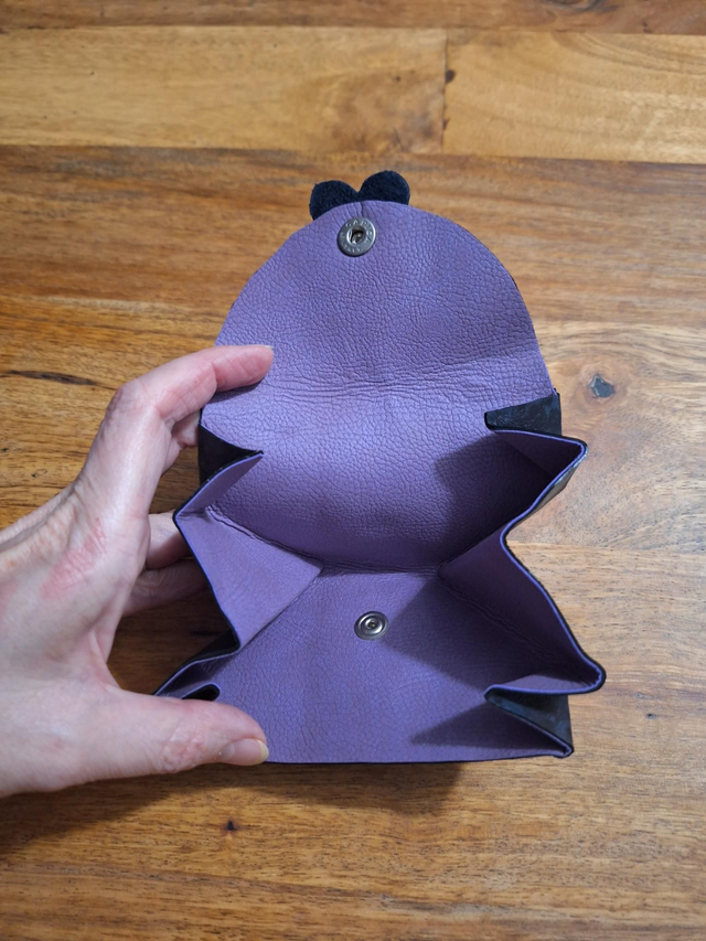 Porte monnaie en cuir bleu imprimé et fleur noire