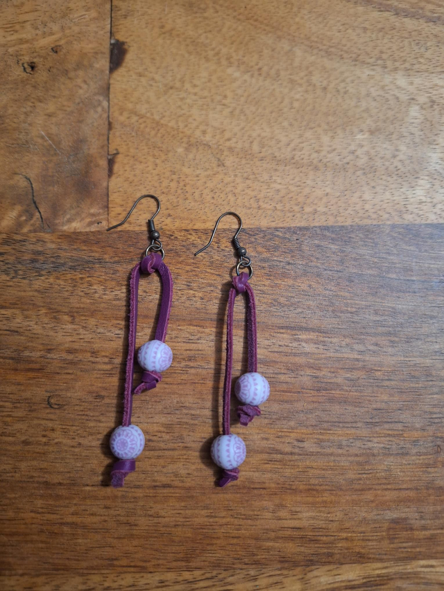 Boucles d'oreilles en cuir violet avec perles mauve motif mandala.