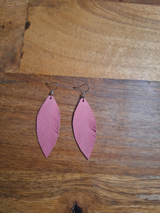 Boucles d'oreilles plumes en cuir rose.