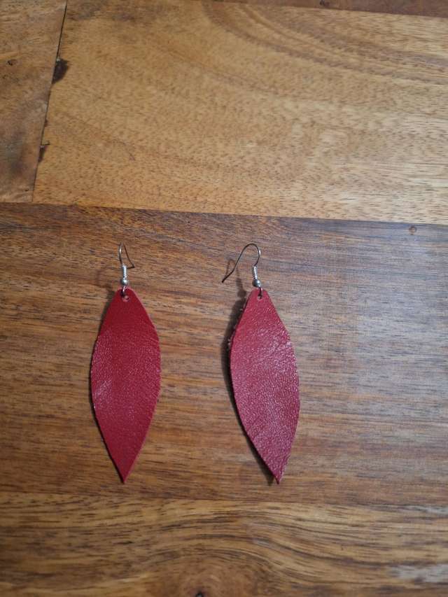 Boucles d'oreilles plumes en cuir rouge.