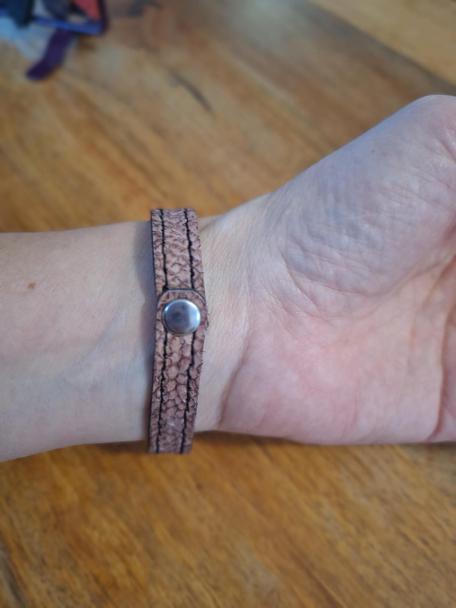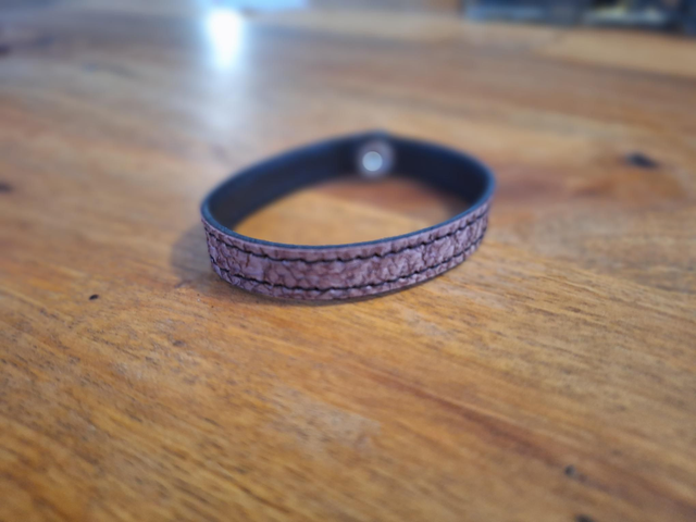 Bracelet en cuir de poisson (saumon) rose doublé en cuir de veau noir.
