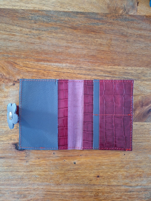 Porte-carte en cuir de vache imprimé croco framboise et fleur en cuir gris.