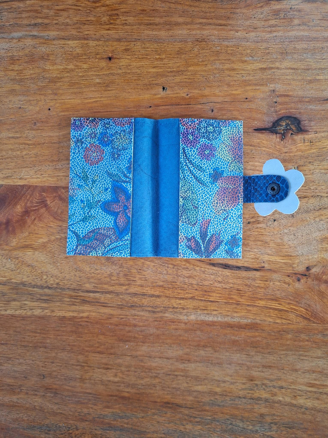 Porte-cartes en cuir d'agneau bleu imprimé serpent et cuir imprimé fleuri.