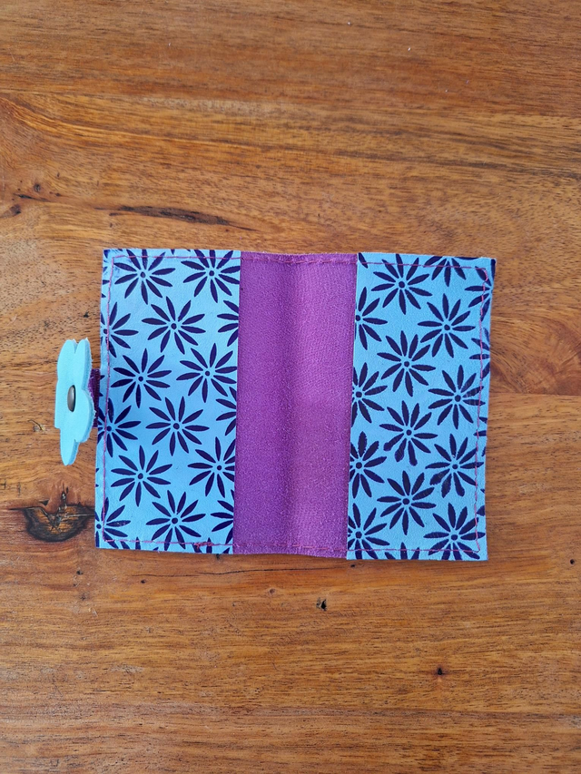 Porte-carte en cuir de vachette violet et cuir d'agneau turquoise imprimé fleurs et fleur en cuir turquoise.