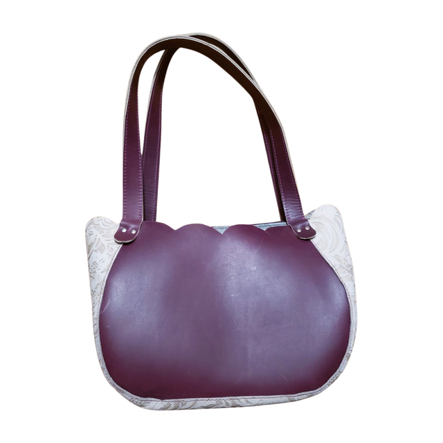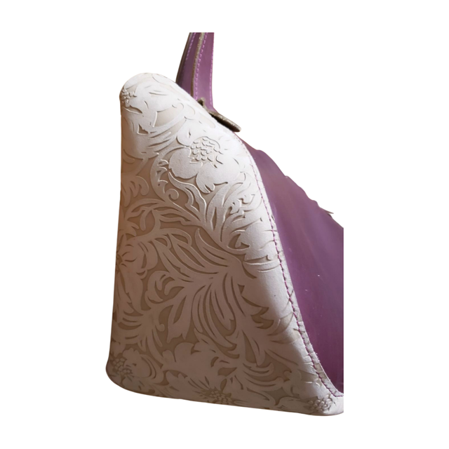 Le sac Orchidée blanc est une création artisanale unique. Fabriqué en France à partir de cuir français. C'est un sac qui est entièrement découpé à la main. Couleur prune et blanc cassé imprimé. Il est accompagné d'une pochette amovible en tissu gris clair avec 2 poches intérieures. Dim: L36 x H20 x P16 cm.
